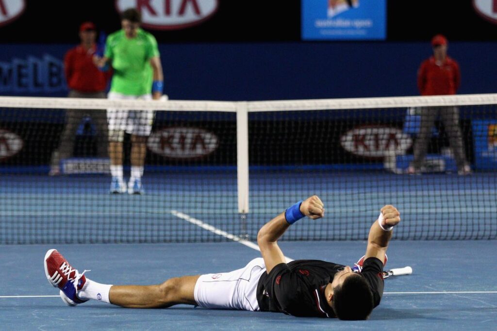 🎥 مثال: في نهائي أستراليا 2012 ضد نادال، استمرت التبادلات إلى حدود 30 و40 ضربة. نوفاك لم يكن يهاجم، بل كان ينهك الخصم نفسيا. هو لم يفز بالنقطة فقط… بل فاز بالمعركة التالية.